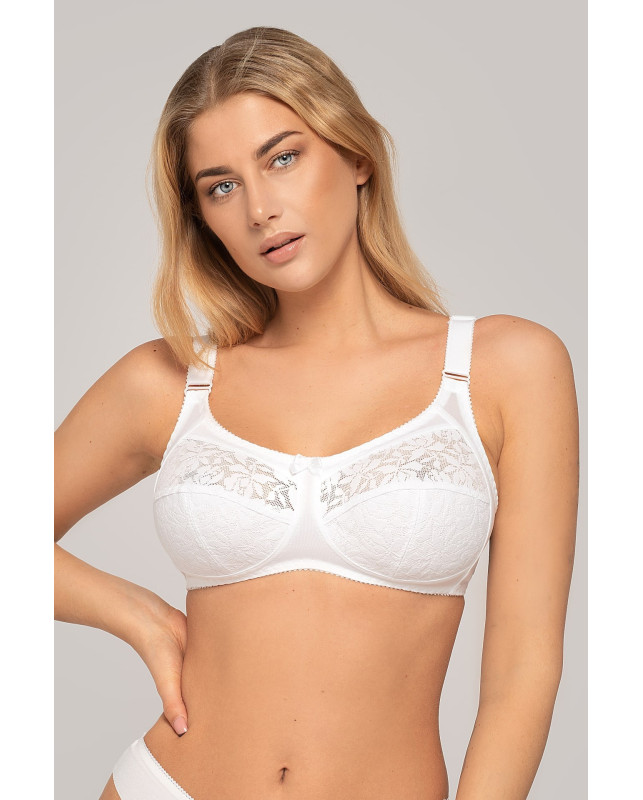 Biustonosz 04 Flowerline Gr.A-D ● nieusztywniany, wysoko zabudowany, bez fiszbinów ● szerokie, regulowane ramiączka ● z delikatną koronką, pięknie zdobiącą dolną i górną miseczkę ● konstrukcja wzmocniona pionowym cięciem miseczek ● wspierający panel boczny w miseczkach ● wnętrze miseczek pokryte jest dzianiną bawełnianą ● doskonale podtrzymuje, dopasowuje się i nadaje szczególny kształt biustowi ● tylne zapięcia wykonane na trzy haftki z dwustopniową regulacją obwodu ● zaprojektowany z myślą o kobietach z dużym biustem, ceniących sobie komfort