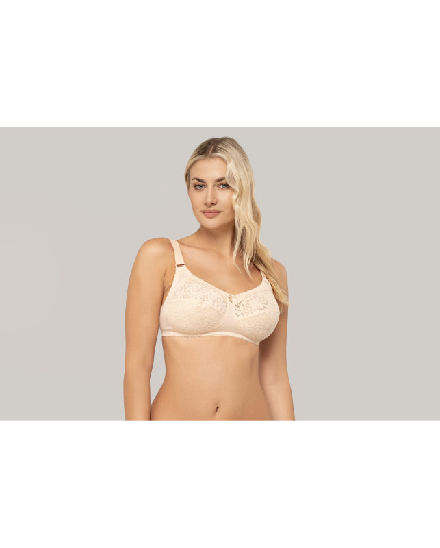 Biustonosz 04 Flowerline Gr.A-D ● nieusztywniany, wysoko zabudowany, bez fiszbinów ● szerokie, regulowane ramiączka ● z delikatną koronką, pięknie zdobiącą dolną i górną miseczkę ● konstrukcja wzmocniona pionowym cięciem miseczek ● wspierający panel boczny w miseczkach ● wnętrze miseczek pokryte jest dzianiną bawełnianą ● doskonale podtrzymuje, dopasowuje się i nadaje szczególny kształt biustowi ● tylne zapięcia wykonane na trzy haftki z dwustopniową regulacją obwodu ● zaprojektowany z myślą o kobietach z dużym biustem, ceniących sobie komfort