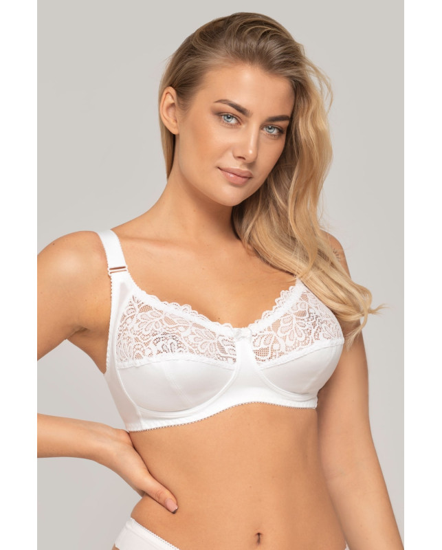 Biustonosz 06 Unite Gr.A-D ● nieusztywniany, z wysokim mostkiem, bez fiszbinów ● szerokie, regulowane ramiączka ● delikatna dzianina w połączeniu z elegancką koronką ● konstrukcja wzmocniona pionowym cięciem miseczek ● wspierający panel boczny w miseczkach ● wnętrze miseczek pokryte jest dzianiną bawełnianą ● doskonale podtrzymuje i dopasowuje się do biustu ● tylne zapięcie wykonane na trzy haftki z dwustopniową regulacją obwodu ● zaprojektowany z myślą o kobietach z dużym biustem, ceniących sobie komfort, wygodę