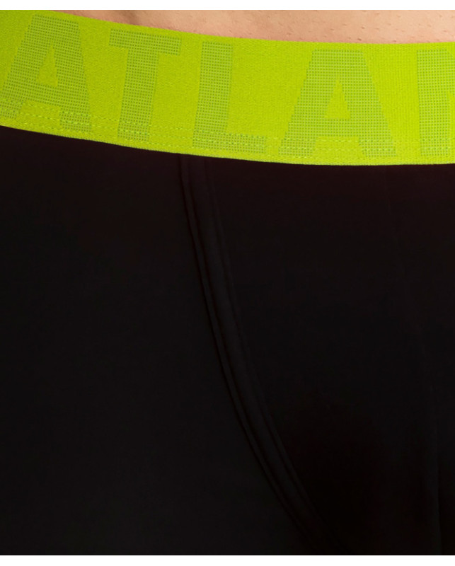Bokserki męskie w kolorze czarnym zaznaczone są w talii szeroką i miękką gumą, na której wytłoczona jest sporych rozmiarów nazwa marki. Bielizna o sportowym charakterze mają uniwersalnej długości nogawki oraz niską talię, która wykończona jest wspomnianą gumą zewnętrzną. Przyjemna w dotyku guma nie uciska ciała i nie wbija się w nie, tym samym zapewnia mu maksymalny komfort. Bokserki wykonane są z dzianiny, która jest kombinacją delikatnego mikromodalu oraz rozciągliwego elastanu. Przyjazna dla skóry dzianina jest przewiewna i chłodna w dotyku co daje poczucie komfortu w upalne dni. Do jej wyprodukowania zużywa się znacznie mniej wody niż do wytwarzania innych dzianin. Bokserki pakowane w eleganckie pudełko.