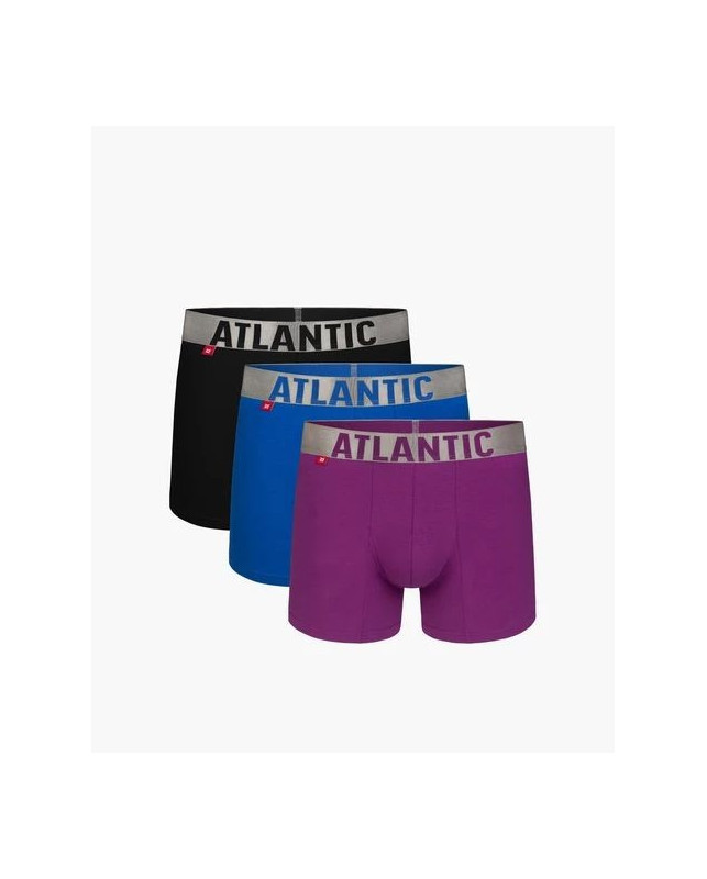 W trzypacku znajdują się sportowe bokserki męskie o niskim stanie oraz uniwersalnej długości nogawki. W talii zaznaczone są 4-centymetrową, niezwykle miękką i nieuciskającą ciała gumą zewnętrzną ozdobioną sporych rozmiarów logo Atlantic. Majtki perfekcyjnie dopasowują się do sylwetki i do niej przylegają dzięki zastosowanym tu profilującym szwom. Do wykonania bielizny sięgnięto po dzianinę cotton stretch, będącą połączeniem delikatnej bawełny i rozciągliwego elastanu. Dzianina jest przyjemna w dotyku, wytrzymała i odporna na wysokie temperatury. Ma też zdolność przepuszczania powietrza, dzięki czemu zapobiega nadmiernemu poceniu się ciała.