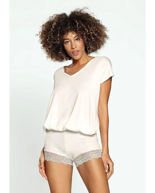 Komplet Tamara ● elegancka piżama wykonana z przyjemnej w dotyku wiskozy ● składa się z luźnej koszulki ze ściągaczem oraz krótkich spodenek ● tył koszulki oraz spodenki ozdobione są piękną, wzorzysta koronką ● wygodny krój pozwala zrelaksować się w dobrym stylu ● wykonany z wysokiej jakości materiałów