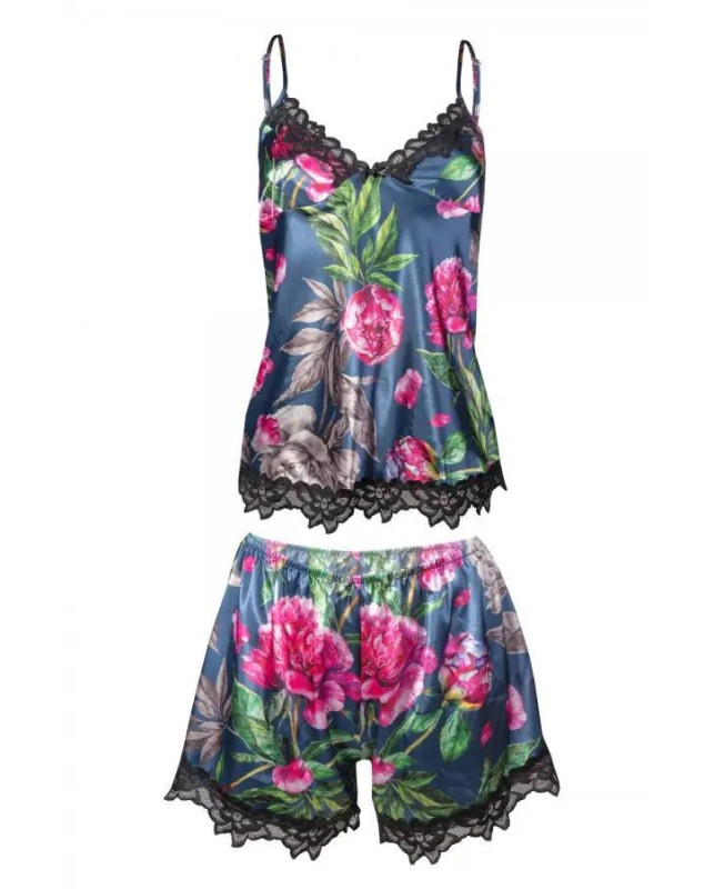 Komplet Flowers Koronka DK-KV ● składa się ze zwiewnej koszulki na cienkich ramiączkach oraz krótkich, luźnych spodenek ● przód topu tworzą dopasowane, trójkątne miseczki obszyte elegancką koronką ● dół koszulki oraz nogawki spodenek również zakończone koronką ● regulowane ramiączka pozwolą dopasować górę ● prosty fason, idealny do relaksu, zapewni dobry sen ● wykonany z satyny jest lekki i przewiewny, idealny na gorące noce