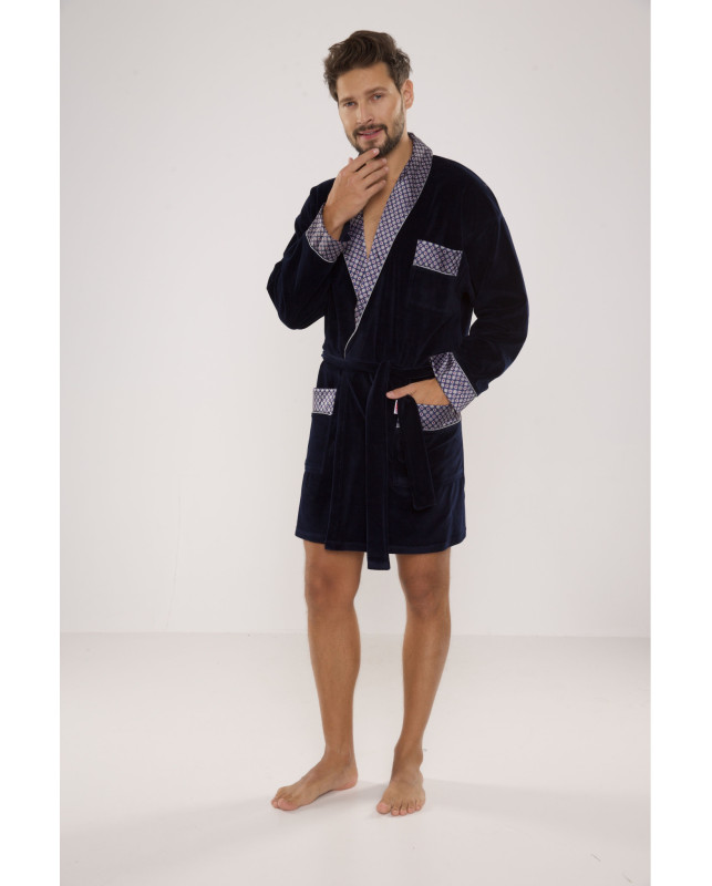 Szlafrok Bonjour 772 ● welurowy, krótki ● z eleganckim, szalowym kołnierzem ● wiązany w pasie ● posiada dwie kieszenie na wysokości bioder oraz jedną mniejszą na wysokości klatki piersiowej ● mankiety, kołnierz i kieszenie wykończone wzorzystą satyną